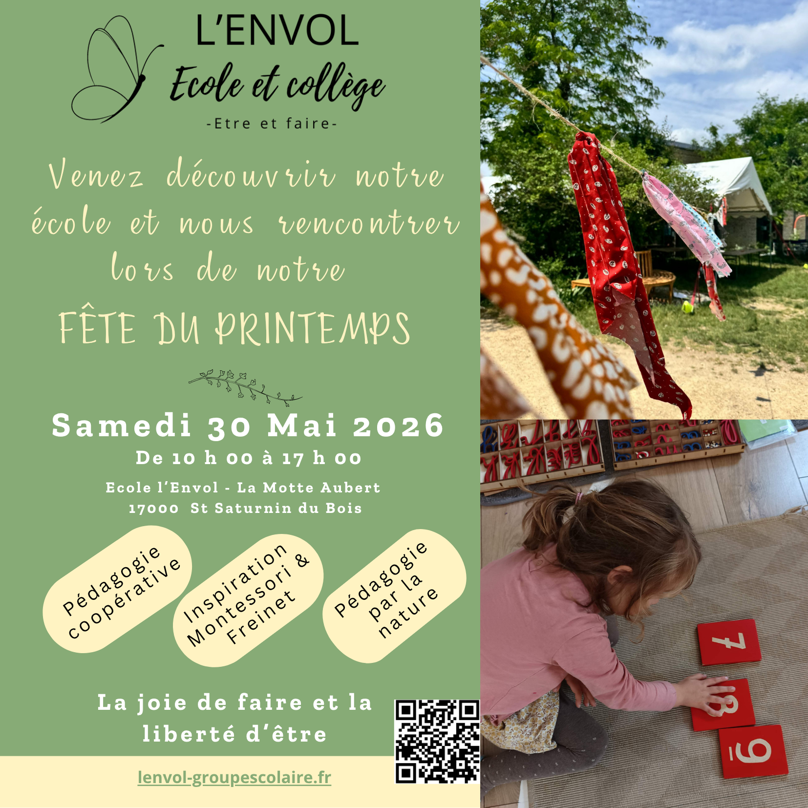 L’ENVOL est un groupe scolaire comprenant une école et un collège privés laïques hors contrat à pédagogie coopérative active d’inspiration Montessori et Freinet, et de la « pédagogie par la nature » aussi appelé « école en forêt ».